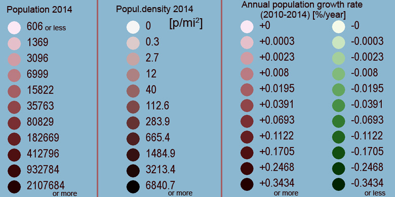 Estimated population for 2014[1]. Population density is in p./sq.mi [4]. Changes are for period 2010-2015. Value is %/year. Boundary lines are approx. 2012 [5]. Click on flag to hide it.